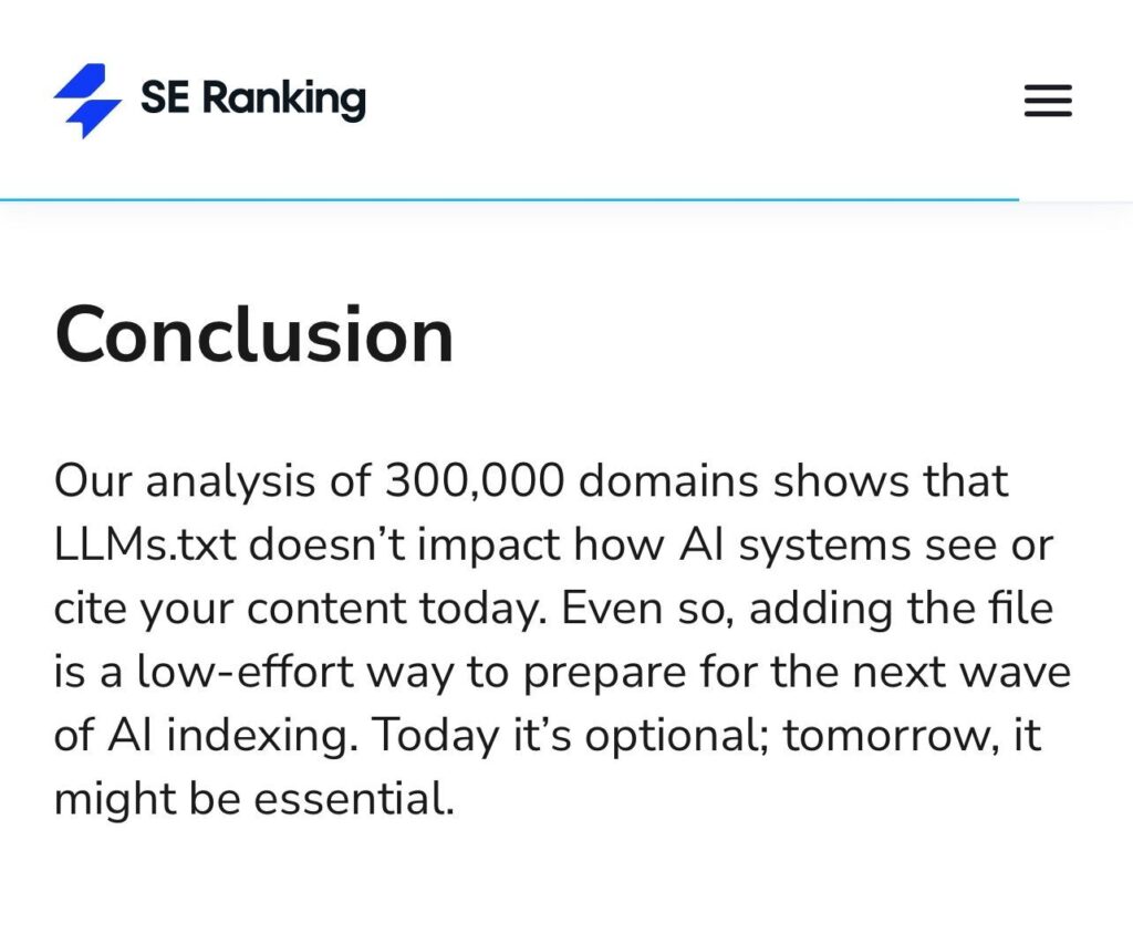La conclusión es rotunda: actualmente, el archivo LLMs.txt no impacta en cómo los sistemas de IA ven o citan tu contenido.